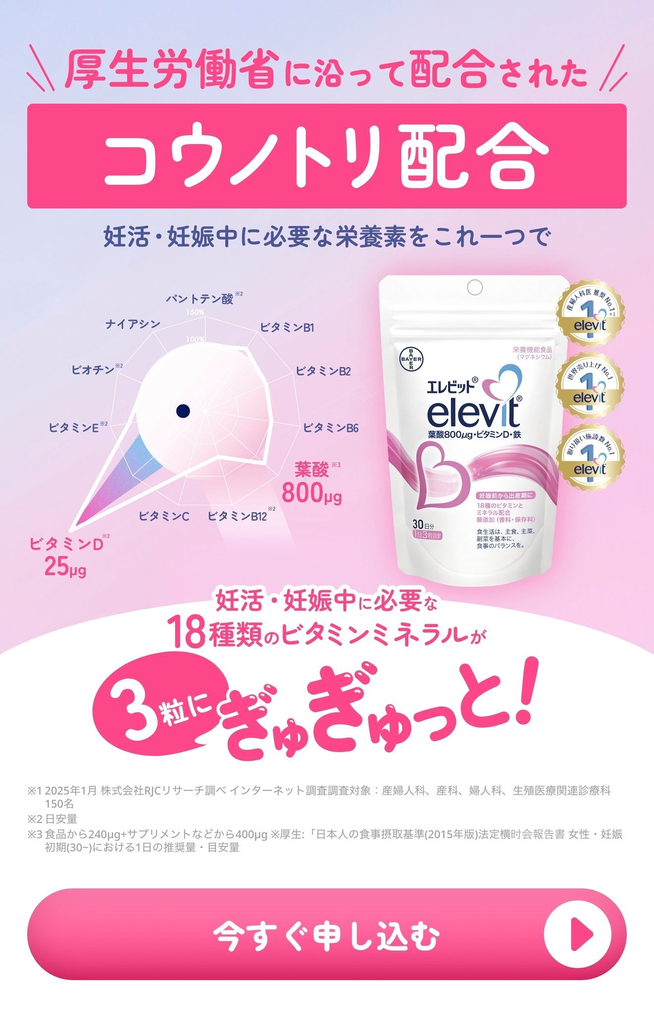 1984年に発売されて以来、79の国※1と地域の女性から選ばれている世界売上No.1※2のプレナタルマルチビタミンサプリメント「エレビット」は製薬会社のバイエルが開発したマルチビタミンサプリメント。